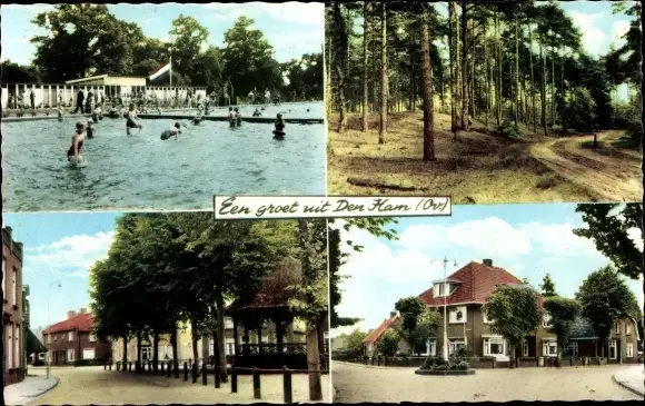 Ak Den Ham Overijssel, Freibad, Wald, Straßenpartie