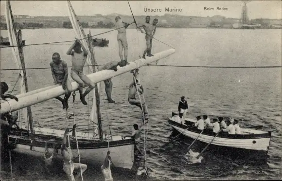 Ak Deutsche Marinesoldaten beim Baden, Schiff, Ruderboot