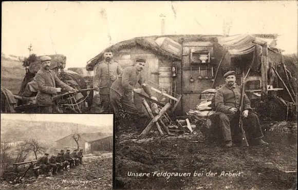 Ak Deutsche Soldaten in Uniformen, Unterstand, Säge, I WK