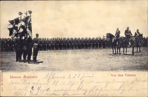 Ak Deutsche Soldaten in Uniformen, Vor den Fahnen