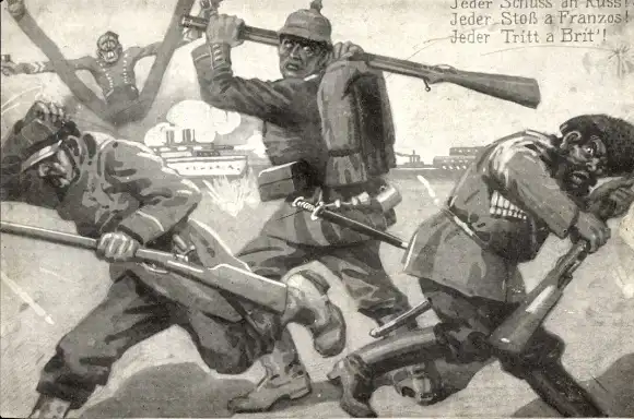 Ak Deutscher Soldat schlägt feindliche Soldaten, Jeder Stoß a Franzos, Jeder Tritt a Brit