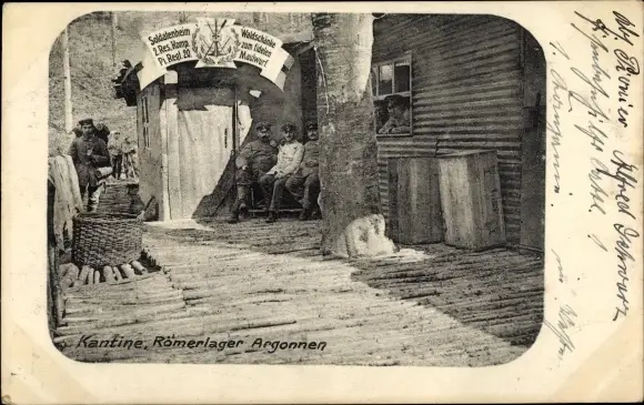 Ak Deutsches Armeelager in den Argonnen, Römerlager, Kantine, Soldatenheim, Zum fidelen Maulwurf