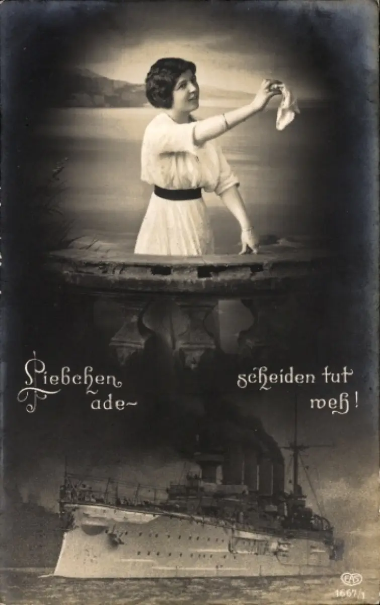 Ak Deutsches Kriegsschiff, Frau winkt zum Abschied