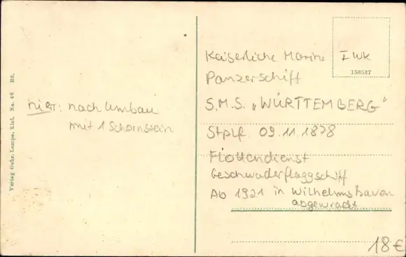 Ak Deutsches Kriegsschiff SMS Württemberg, Panzerschiff, Kaiserliche Marine