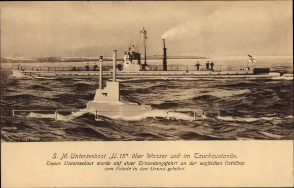Ak Deutsches U Boot, SM U 15, Über Wasser und im Tauchzustand, Kaiserliche Marine