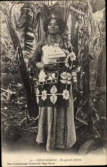 Ak Diego Suarez Madagaskar, En grande toilette, Frau in Festkleidung