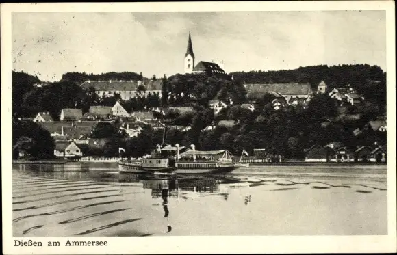 Ak Dießen am Ammersee Oberbayern, Teilansicht, Boot, Kirche