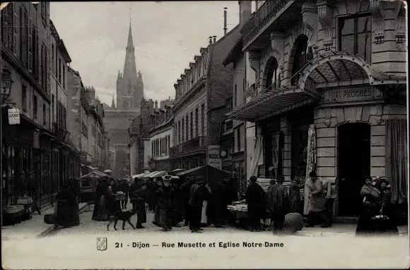 Ak Dijon Côte d'Or, Rue Musette et Eglise Notre Dame