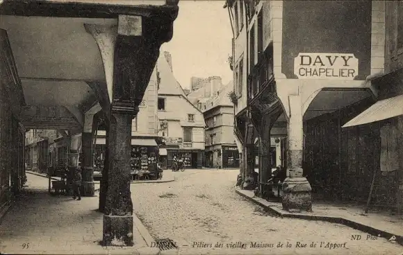 Ak Dinan Côtes-d'Armor, Säulen der alten Häuser, Rue de l'Apport
