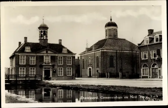 Ak Dinteloord Nordbrabant, Gemeentehuis en Ned. Herv. Kerk