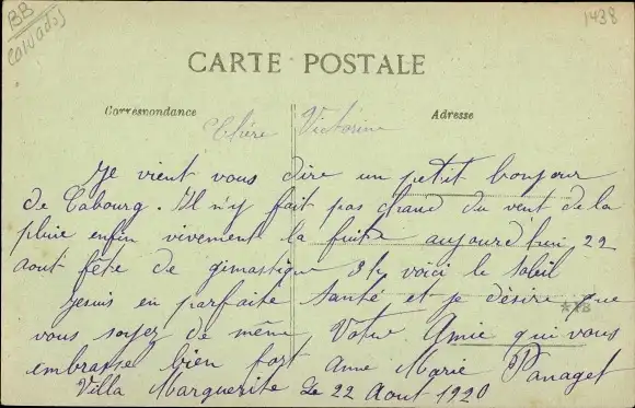 ungelaufen, Rückseite beschrieben, datiert 1920, sonst guter Zustand