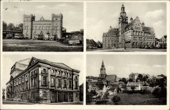 Ak Döbeln in Mittelsachsen, Bahnhof, Rathaus, Stadttheater, Schule, Kirche