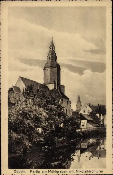 Ak Döbeln in Mittelsachsen, Mühlgraben mit Nikolaikirchturm