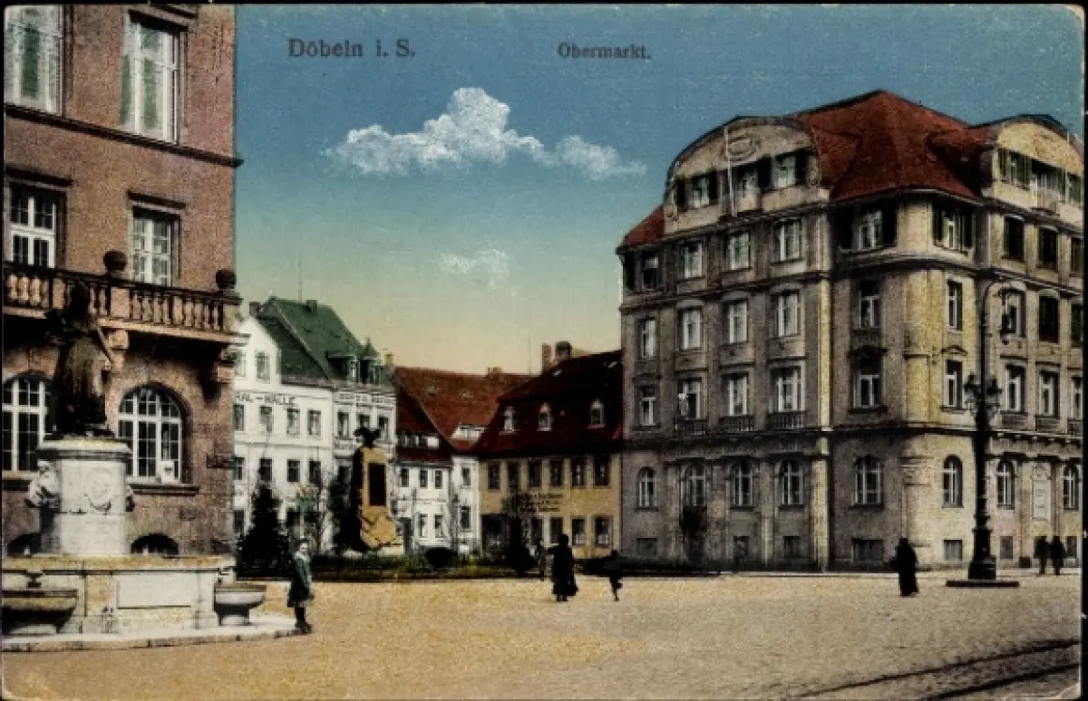 Ak Döbeln in Sachsen, Dobeln i. S., Obermarkt, Gebäude, Statue, Menschen