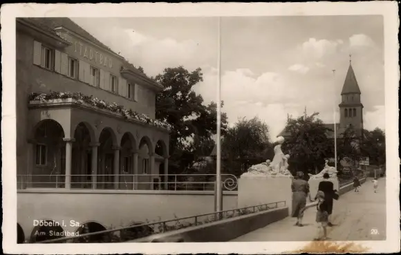 Ak Döbeln in Sachsen, Stadtbad, Passanten, Kirchturm