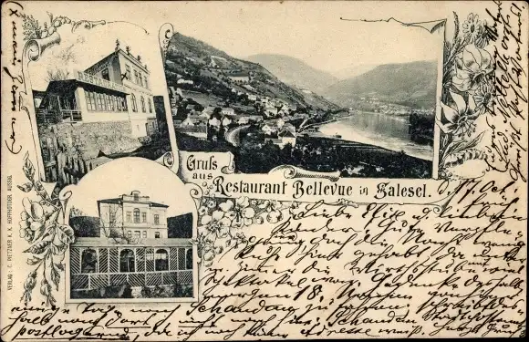 Ak Dolní Zálezly Salesel Region Aussig, Restaurant Bellevue, Blick auf den Ort