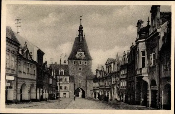 Ak Domažlice Taus Region Pilsen, Straßenpartie, Turm, Häuser