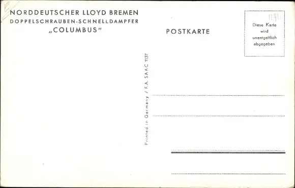 Ak Doppelschraubenschnelldampfer Columbus, Norddeutscher Lloyd Bremen