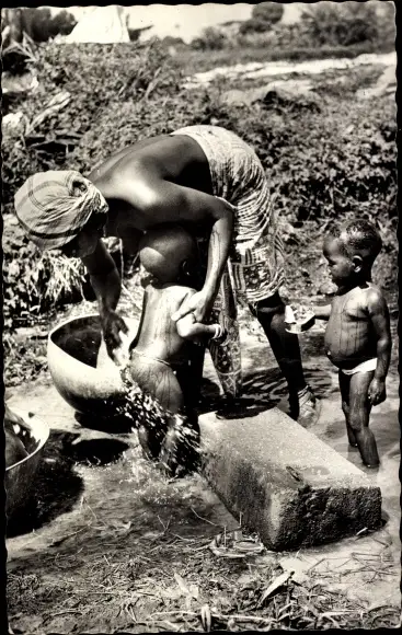 Ak Dorf in Afrika, Afrikanerin wäscht ihre Kinder