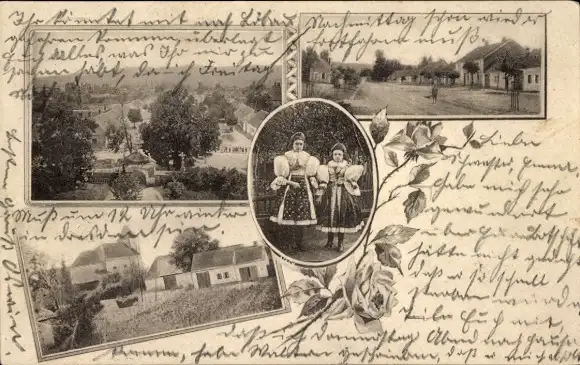 Ak Dorfansicht, Straßenpartie, Kirche, Frauen in Volkstrachten