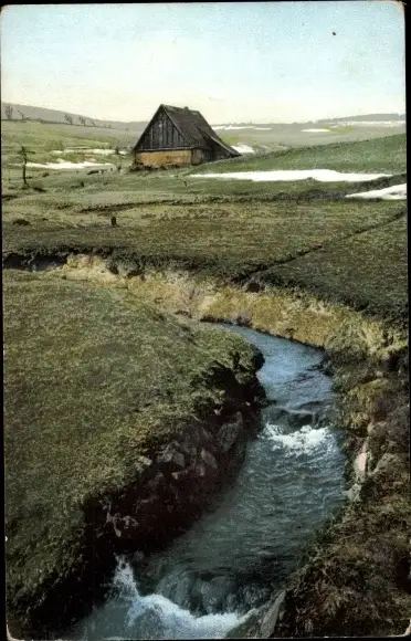 Ak Dorfidyll, Felder, Fluss, Wohnhaus