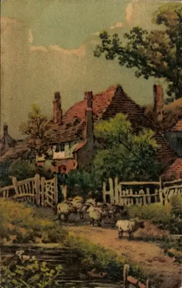 Ak Dorfidyll, Schafherde, Schafe, Wohnhaus, Zaun