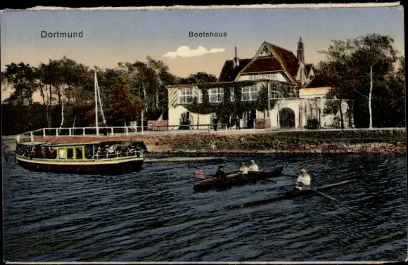 Ak Dortmund im Ruhrgebiet, Bootshaus, Ruderer, Schiff