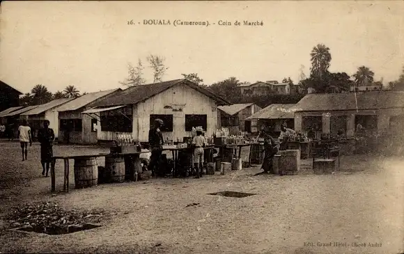 Ak Douala Duala Kamerun, Markt mit Verkaufsständen, Menschen, Gebäude