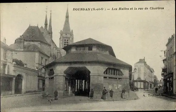Ak Dourdan Essonne, Les Halles et la rue de Chartres