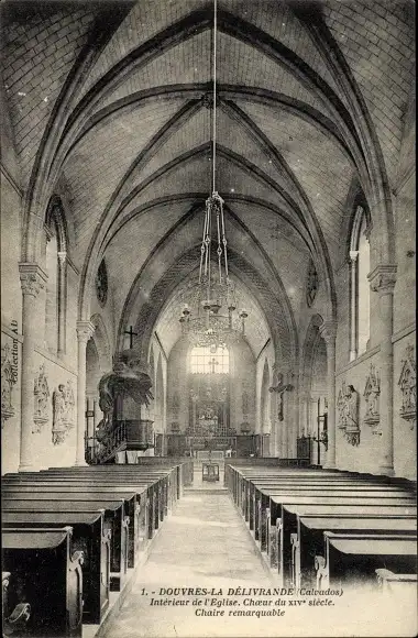 Ak Douvres-la-Délivrande Calvados, Interieur de l'Eglise, Choeur du XIVe siecle, Chaire remarquable