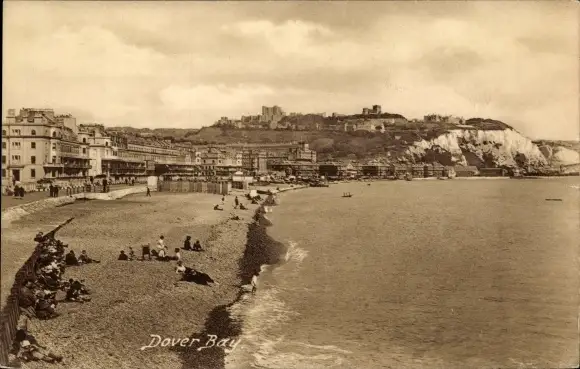 Ak Dover Kent England, Dover Bay, Strand, Strandgäste, Stadtansicht, Felsen