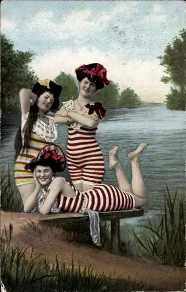 Ak Drei Frauen in gestreiften Badeanzügen, Porträt