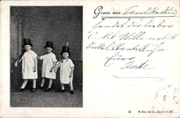 Ak Drei Jungen, Portrait, Zylinder, Gehstock