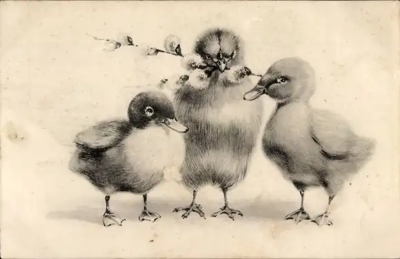 Ak Drei Küken, Weidenkätzchen, Ostern