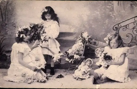 Ak Drei Mädchen mit Puppen, Blumen