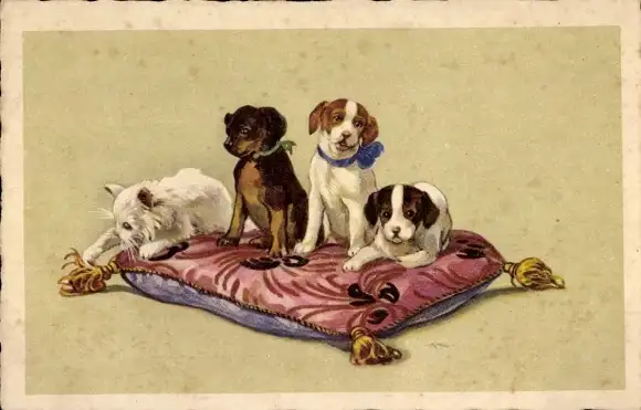 Ak Drei junge Hunde und eine weiße Katze auf einem Kissen
