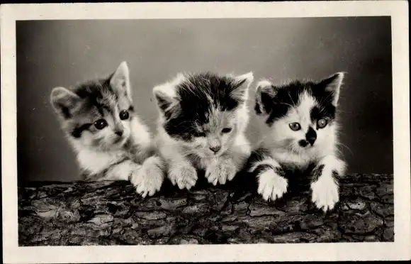 Ak Drei junge Katzen am Holzstück, Tierporträt