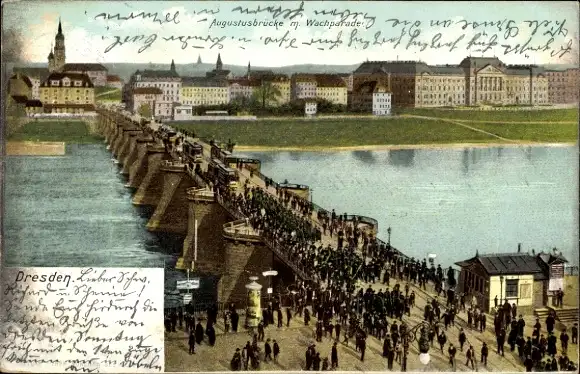 Ak Dresden Altstadt, Augustusbrücke mit Wachparade
