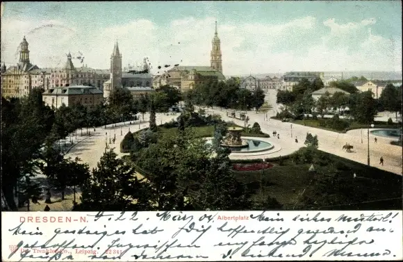 Ak Dresden Neustadt, Albertplatz, Kirche, Straßenbahn, Brunnen