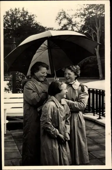 Ak Drie Prinsessen onder moeders parapluie, Prinzessinnen Beatrix, Irene, Margriet, Soestdijk 1955