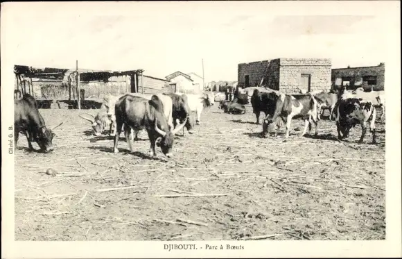 Ak Dschibuti, Parc à Boeufs, Rinderherde grast auf einem Hof