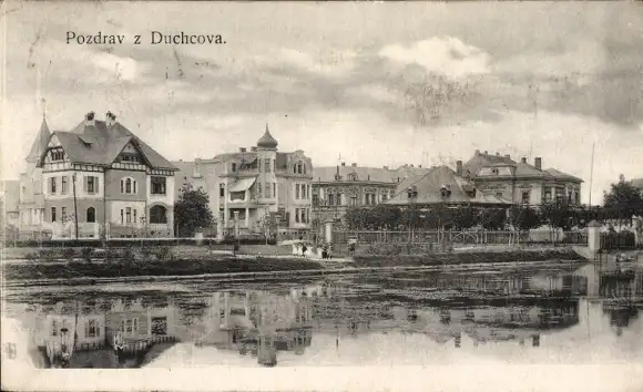 Ak Duchcov Dux Region Aussig, Teilansicht, Ufer, Gebäude