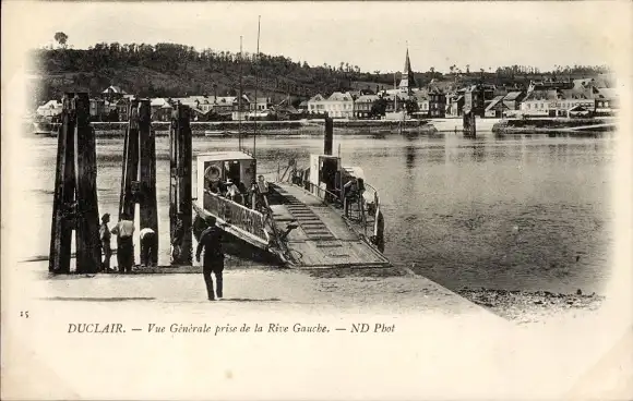 Ak Duclair Seine Maritime, Blick über das Wasser, Fähre, Häuser, Kirche, ruhige Szenerie