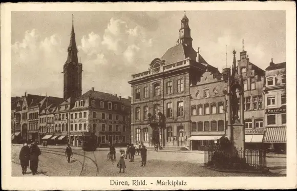 Ak Düren im Rheinland, Marktplatz, Kirche, Straßenbahn