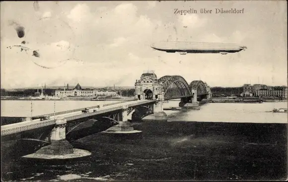 Ak Düsseldorf am Rhein, Zeppelin über der Stadt, Brücke