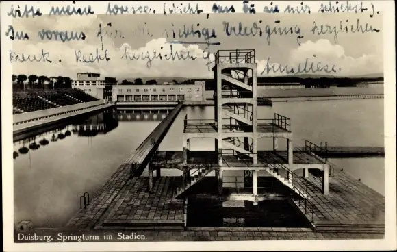 Ak Duisburg im Ruhrgebiet, Springturm mit Stadion