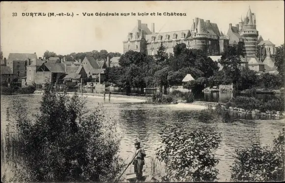 Ak Durtal Maine et Loire, vue générale du Château et du Loir, Flusspartie