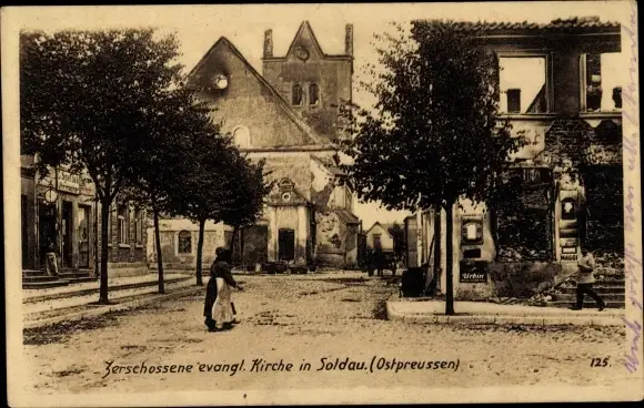 Ak Działdowo Soldau Ostpreußen, Zerschossene evangelische Kirche, 1. WK
