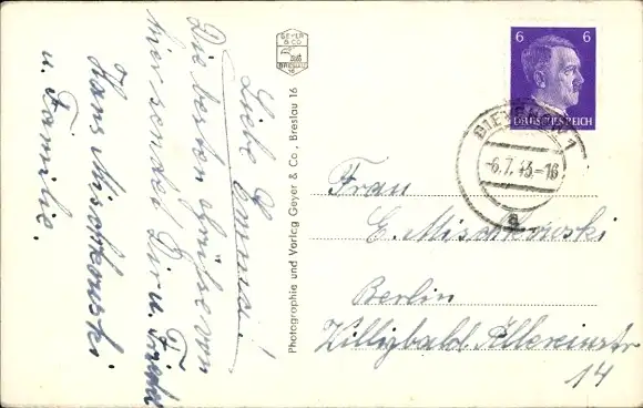 Zustand, siehe Scan, gelaufen, 1943 - ca 14 cm X 9 cm