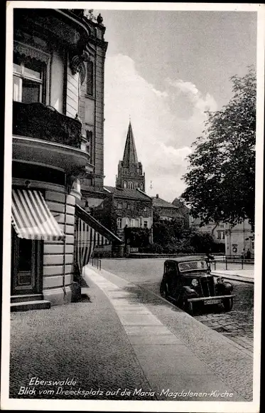 Ak Eberswalde in der Mark, Blick vom Dreiecksplatz auf die Maria Magdalenen Kirche, Auto